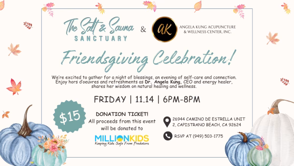 Come celebrate gratitude, community, and wellness with us at Salt & Sauna in Capistrano Beach. Enjoy an inspiring evening as Dr. Angela Kung shares her knowledge and wisdom in natural healing and holistic wellness.